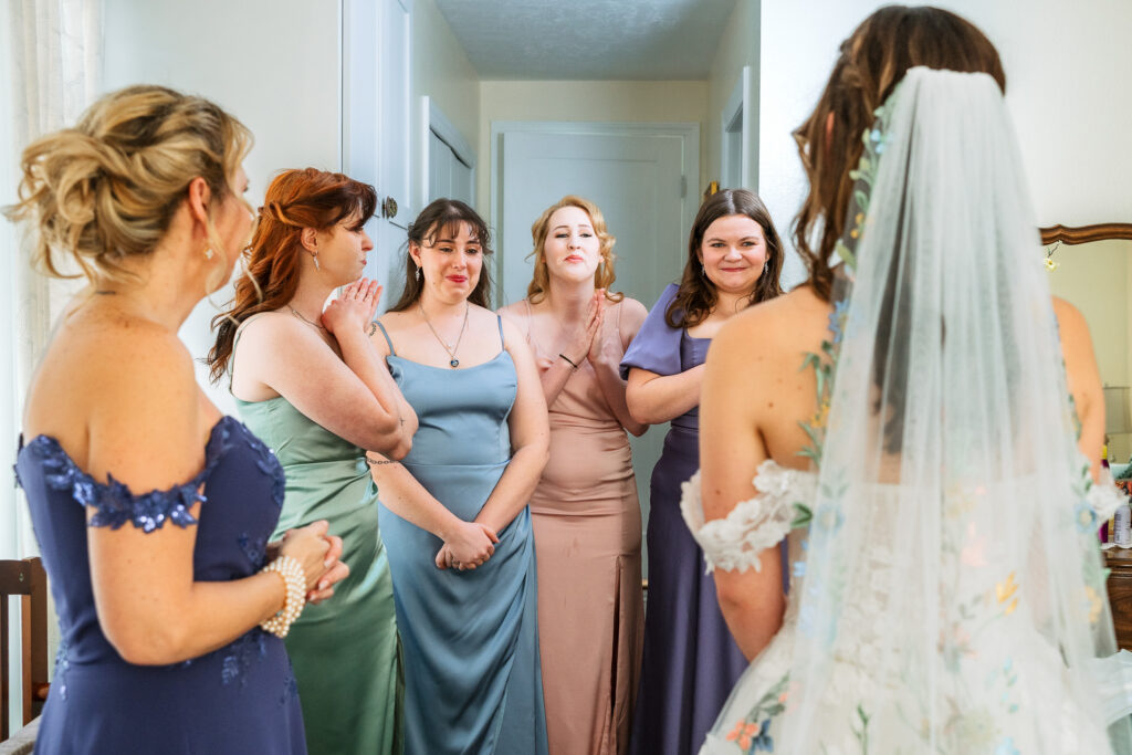 The bridesmaids reacted to seeing her the way bridesmaids react when the bride is genuinely breathtaking. Mouths open, eyes full, hands over hearts. I got it all on camera and I will never stop being grateful for that moment.