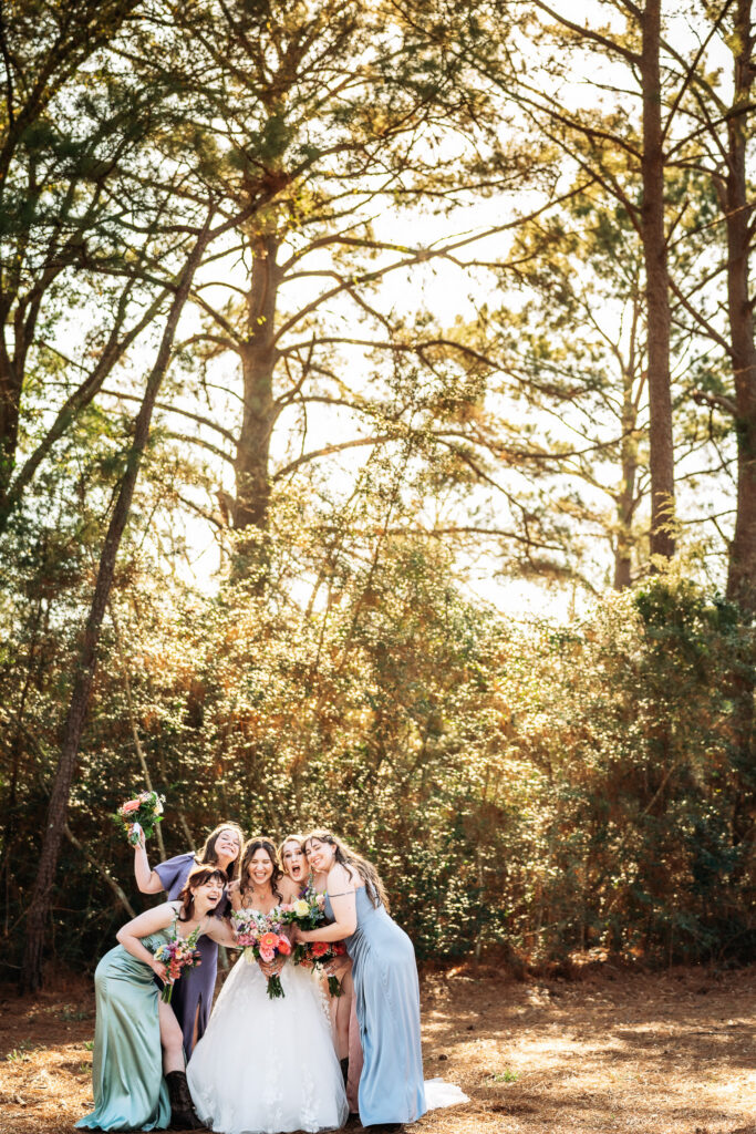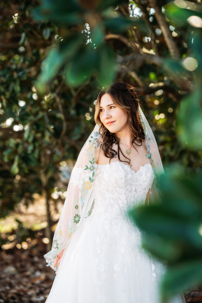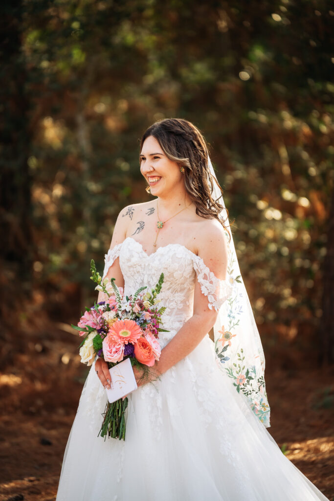 Let me tell you about Makenna’s veil. Hand embroidered wildflowers in every color, blue and yellow and pink and green, scattered across the tulle like someone spent months sewing a meadow into it. Because someone did. It was one of the most personal, most gorgeous things I have ever photographed and it looked absolutely perfect against the pine trees and the lake light of Camp Journey Woods.