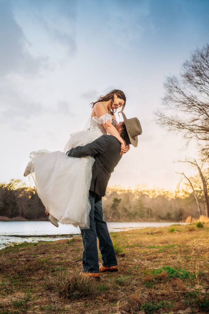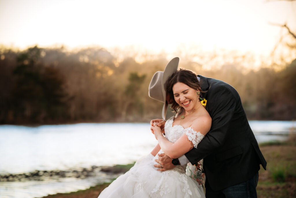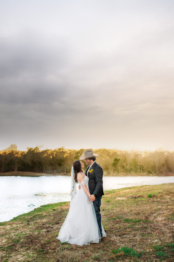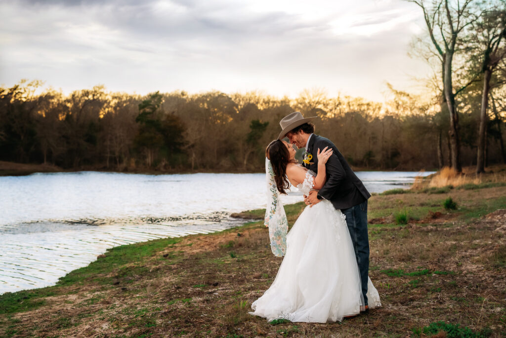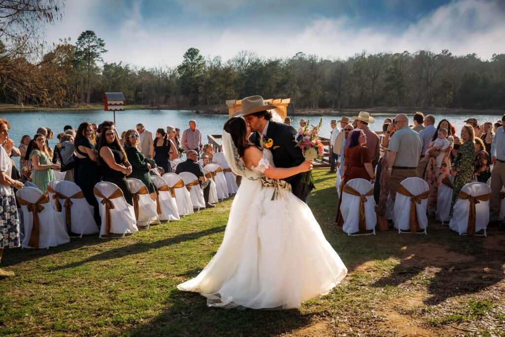 The ceremony happened right at the edge of the lake as the sun was doing its absolute most. A wooden arch draped in white linen and Brenham Wildflowers Florist blooms framing that blue water behind them. Joseph in his cowboy hat, reading his vows, hands bound together in a handfasting ceremony that felt ancient and tender and completely them. The flower girl dumped her entire basket of petals in one magnificent go and honestly she was right for it. No half measures at this wedding.
